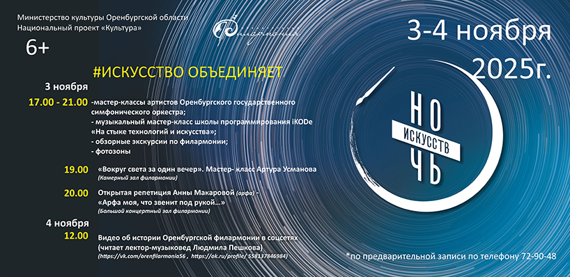 3 - 4 ноября Оренбургская областная филармония примет участие в ежегодной культурно-образовательной акции «Ночь искусств».
